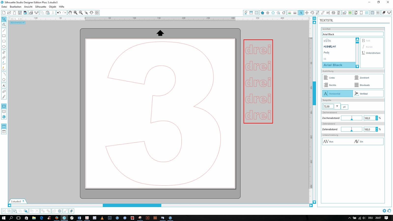Nachdem ihr das Studio geöffnet habt, tippt ihr eure gewünschte Zahl oder den gewünschten Buchstaben ein oder erstellt eine Form, in die ihr Wörter anordnen möchtet. In meinem Beispiel habe ich die Zahl "3" gewählt. Als Schriftart eignet sich am besten eine ohne viel Schnörkel und mit einer schönen Breite. Ist eure gewünschte Schriftart schmal, legt ein äußeres Offset drumherum und schon habt ihr eine passende Schriftart. In meinem Beispiel habe ich die Schriftart Arial Black gewählt.